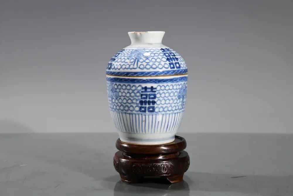这件清代青花喜字盖盅,高11.5厘米,直径8.6厘米。器盖肩部与器身上腹部满绘青花连续圆圈图案,盖、身分别有三个喜字分布于圆圈纹上,两个喜字之间均绘有一个由长条和六个同心圆组合成的图案。器身下腹部绘有竖条纹。喜字与连续衔接的圆圈、同心圆结合,赋予了器物吉祥喜庆、绵延不绝之祝愿。