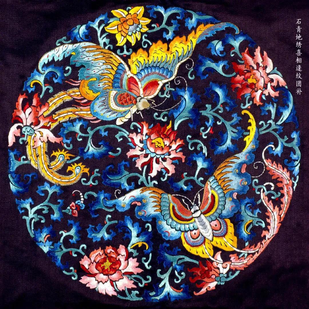 石青地绣喜相逢纹团补 清代